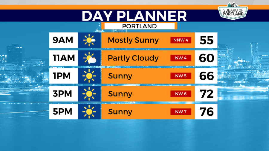 تقع الغيوم في الصباح على طول الشاطئ في الوادي ، مع الكثير من أشعة الشمس في فترة ما بعد الظهر. في المرتفعات النهارية في منطقة مترو بورتلاند ، تقترب درجات الحرارة من 80 درجة.