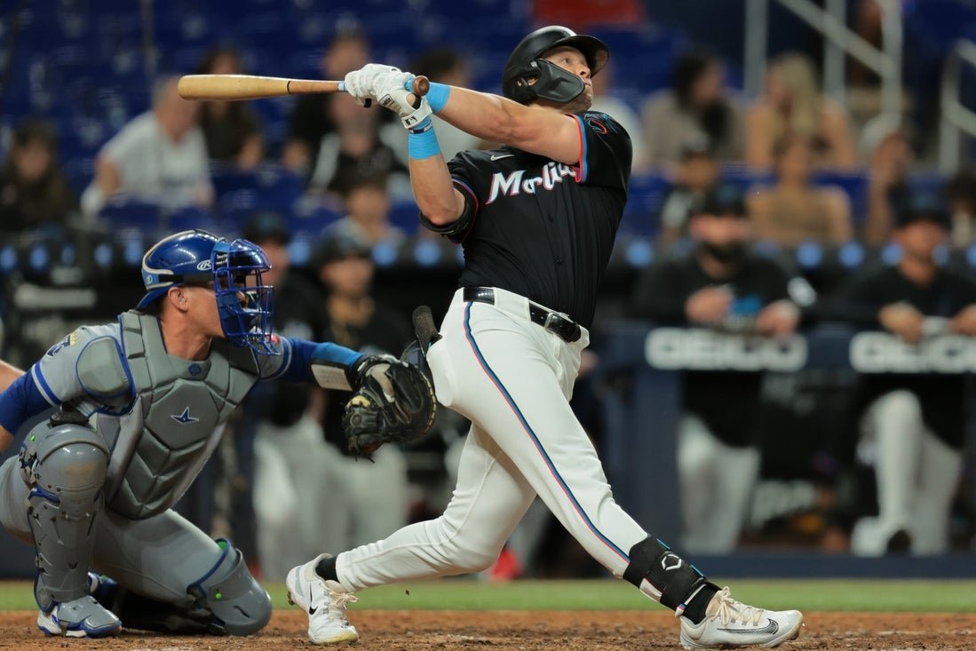 1825 ؛ ميامي ، فلوريدا ، الولايات المتحدة ؛ غادر ميامي مارلينز لاعب الوريد كايل ستوفرز (28 عامًا) ضد موطن كنساس سيتي رويالز. الائتمان الإلزامي: صورة سام نوفمبر-تصور انتقلت All Stars Kyle Stomerz إلى خمسة أشواط ، بما في ذلك انفجار في المحرك العاشر ليفوز في Kansas City Rolls ليلة الجمعة.