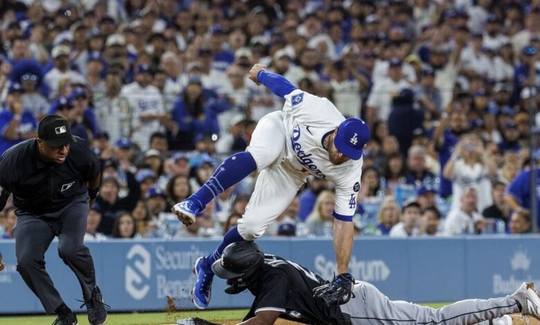 Dodgers Max Muncy Muncyseest من White Sox الخارجي لتصادم مع White Sox الخارجي في ملعب Dodger ، قام بطبخ إله اليسار.