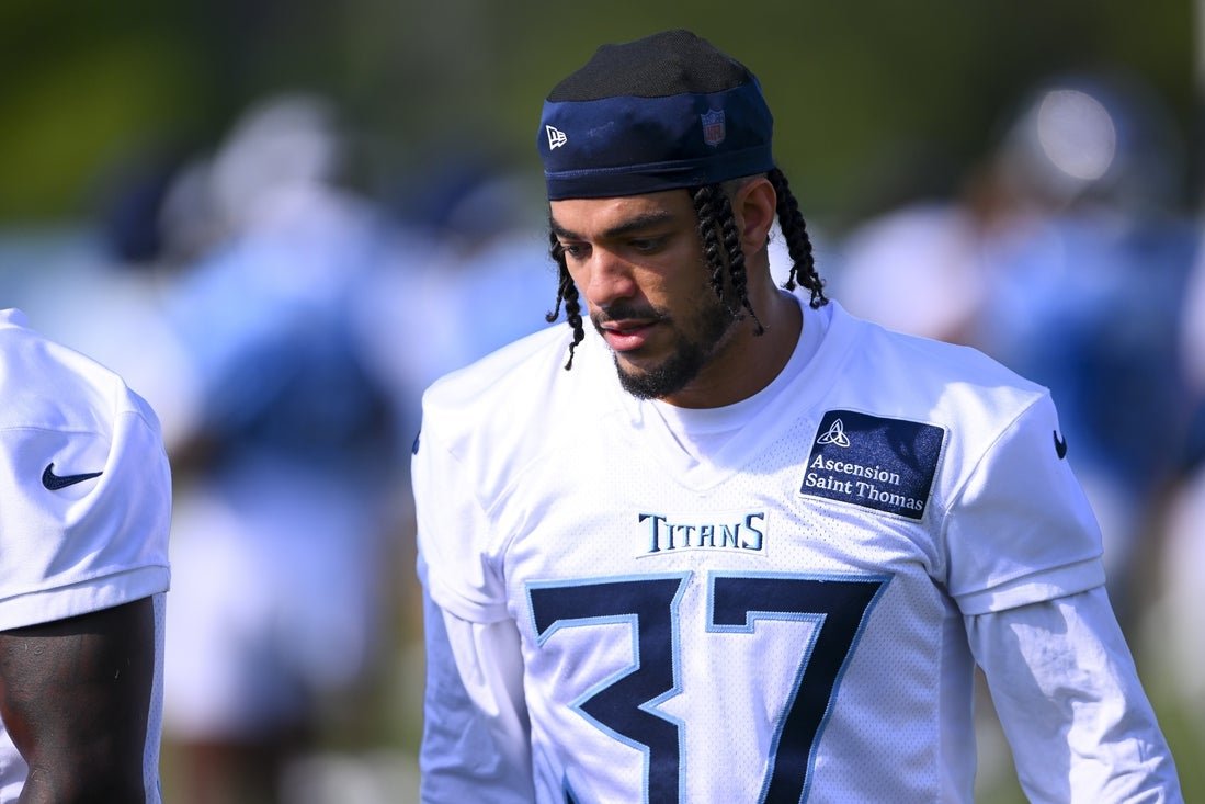 23 يوليو 2025 ؛ ناشفيل ، تينيسي ، الولايات المتحدة الأمريكية ؛ قامت تينيسي جبابرة بحماية ترانكس الأمن خلال تدريب الرياضة الرياضية الرياضية في معسكر التدريب في Sports Park. الائتمان الإلزامي: ستيف روبرتس-iuelibbib وقعت Tennessee Titans على اتفاقية سنوية ثلاثية إلى Malenid Minceni Hoor يوم السبت إلى 59 كهس من 39 روبية لكح.