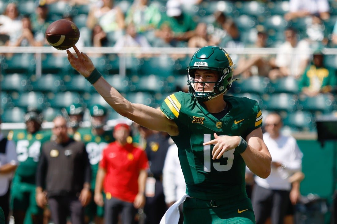 13 سبتمبر 2025 ؛ فاكو ، تكساس ، الولايات المتحدة الأمريكية ؛ بيكر يحمل قورتربك سيرز روبرتسون (13) مكللين يلقي بولدوغ في بالامبارد خلال النصف الأول من ملعب مكللين. الائتمان الإلزامي: صورة كريس جونز-الظهور البقاء على قيد الحياة من بطولة Big 12 Arizona State Nights ليلة السبت في تكساس ، الطريق في تكساس.