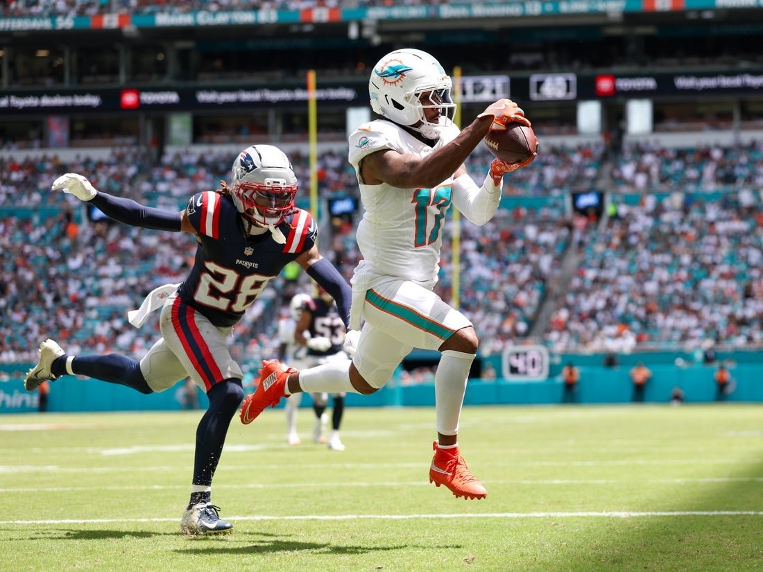 14 سبتمبر 2025 ؛ حديقة ميامي ، فلوريدا ، الولايات المتحدة الأمريكية ؛ ميامي دولفينز واسعة ريسر جايان وادل (17) أشجار أشجار بهادوين الإنجليز الجديدة بواسطة شجرة مؤثرة بلمسة مألوفة و 28) بلمسة. (28) بواسطة لمسة. (28). الائتمان الإلزامي: صورة ناثان راي قامت Miami Dolphins Wide Deferver Joylaine Vadal بتنشيط بعد الانتهاء من الكتف المصاب قبل فواتير Bawflow.
