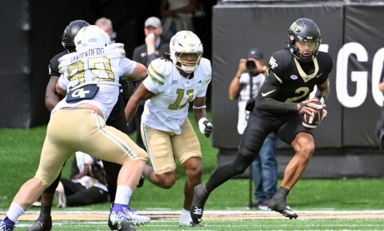 27 سبتمبر 2025 ؛ وينستون سالم ، نورث كارولينا ، الولايات المتحدة ؛ Wow Force Debone قورتربك Tuharback Torback (2) يدير الكرة ضد جاكيتات Yalgassy Tak: Zatri TT-Imperzie صور