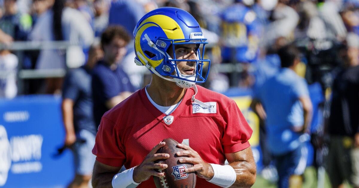 يقدم Linebocker Jonjon UCLA الشفاه بيديه على الوركين ويعبر الحقل خلال اليوم الأول من معسكر Pressence في اليوم الأول من علامة كوستا ميسا.