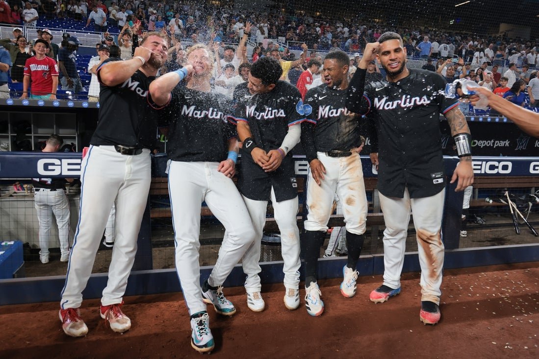 1 أغسطس 2025 ؛ ميامي ، فلوريدا ، الولايات المتحدة ؛ ਮਿਆਮੀ ਮਾਰਲਿਨਸ ਸੈਂਟਰ ਫੀਲਡਰ ਜੈਕੋਬ (87) ، ਖੱਬੇ ਪਾਸੇ ਦੇ ਫੀਲਡਰ ਕਾਈਲ ਸਟਾਈਲਜ਼ (46) ਅਤੇ ਕੈਚਰ ਫੌਰ ਯੈਂਕੀਜ਼ (50) ਨੇ ਲੌਨਮੈਨ ਦੇ (46) ਦੇ ਨਿ ਨਿ ਯਾਰਕ ਯਾਰਕ ਯੈਂਕੀਜ਼ ਖਿਲਾਫ ਖਿਲਾਫ. الائتمان الإلزامي: صورة سام نوفمبر-تصور Javaer Edwards مع التاسع من التاسع من التاسع من ليلة التسعين من الذهب إلى النصر 13-12 خارج الحكم.