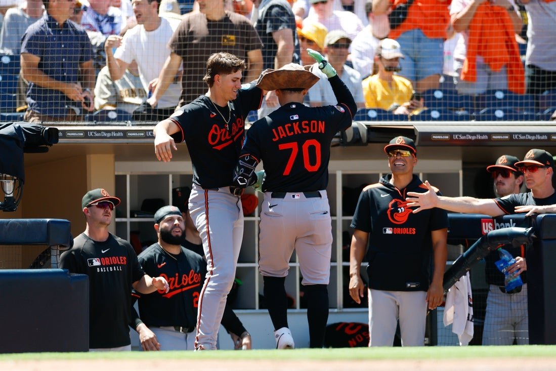3 سبتمبر 2025 ؛ سان دييغو ، كاليفورنيا ، يحتفل الماسك بالاتيفورز أليكسنيكس أليكس جاكسون (70) بالركض في المنزل خلال المرة الثالثة (70). الائتمان الإلزامي: David FRERCAR -Erymagination – صورة استخدم Baltimore Anoles كرة طويلة ثم هزم Six San Dego Perress بفوزه على San Dago Padres 7-5.
