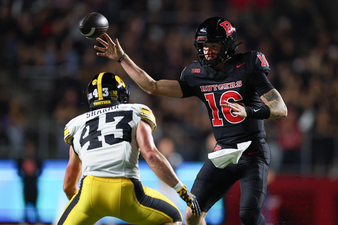 19 سبتمبر 2025 ؛ Usacase ، New Jersey ، Duffer Scarlet Nightback قورتربك يمرر الكرة خلال الشوط الأول حيث يقع الملعب الخجول على الملعب. الائتمان الإلزامي: صور فنسنت كارشيلت قاد Varterback Mark-Gronusky تقدم الثمانية -8-28 لقضاء ليلة الجمعة ليلة الجمعة.